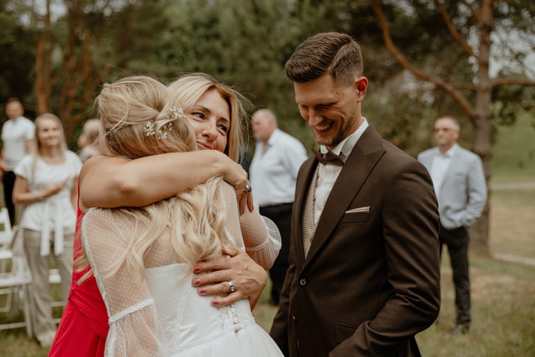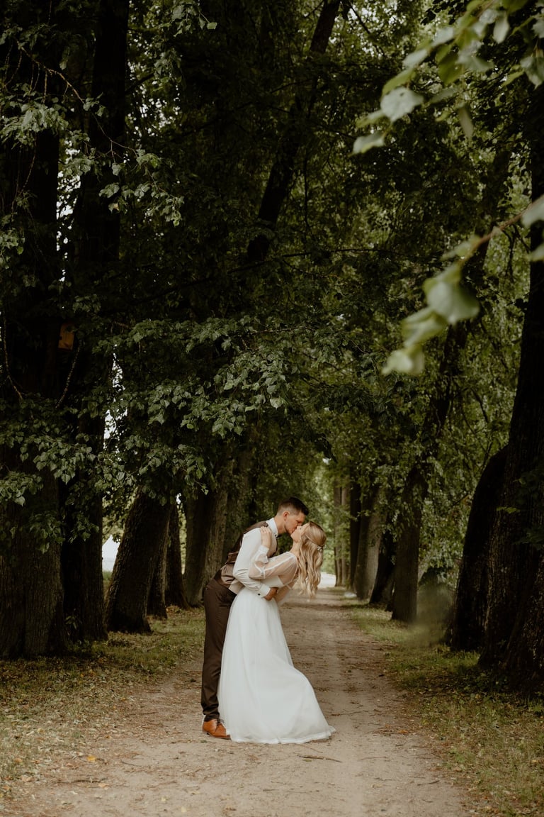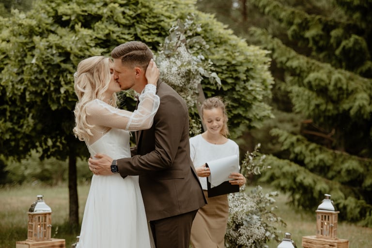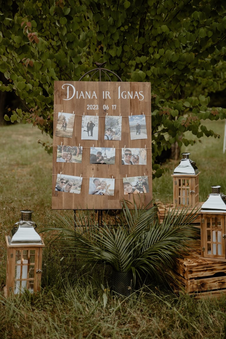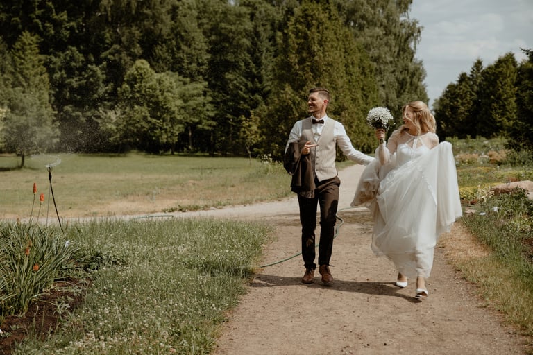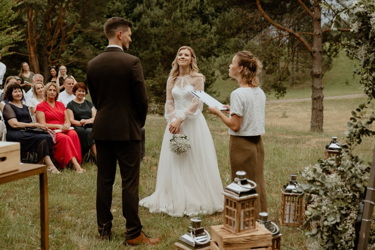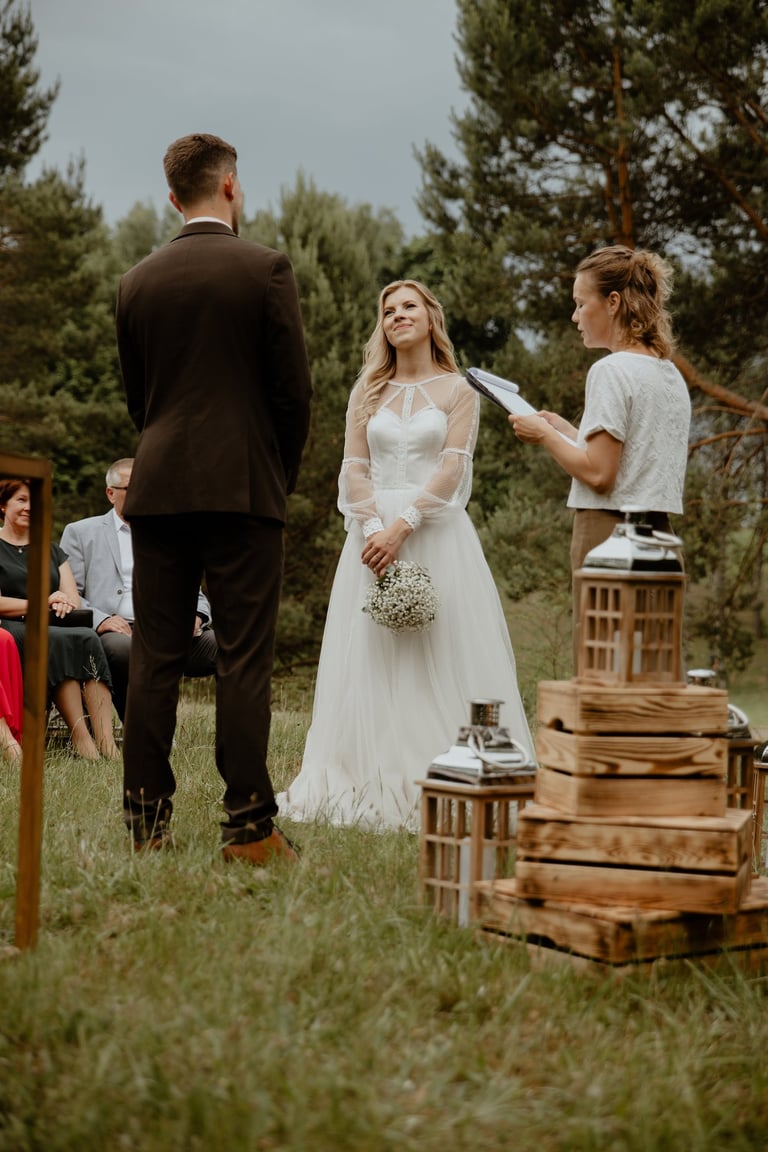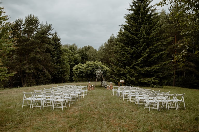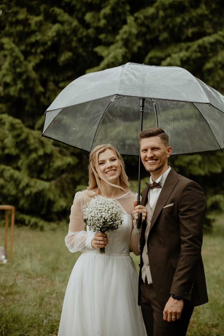 Vestuvių dieną susitikome parke, kuriame ir fotosesiją, ir ceremoniją, ir šventę turėjo. Buvo laabai karšta ir tuo pačiu trošku, stengėmės ieškoti paunksmės, gerti daug vandens ir per daug nesutepti suknelės, nes cermonija laukė po fotosesijos. Fotosesijai jau einant į pabaigą, vis labiau ir labiau kilo vėjas, plaukė tamsūs debesys. Laikėm kumščius, kad audra neužkluptų ceremonijos metu. Taigi, ceremonija praėjo be lietaus, o jau sveikinimų pabaigoje pradėjo po truputi krapnoti ir tada - liūtis. Visi sulindome į šventinę palapinę ir kuo puikiausiai tęsemė šventė. Kai tik koks protarpis be lietaus, grei svečiai pasifotografuoti lekia, dar vienas protarpis - nešame tortą į lauką pjaustyti. Lietus nuostabiai šventei nesutrukdė, o tik suteikė daugiau spalvų ir emocijų