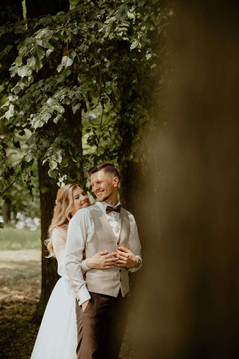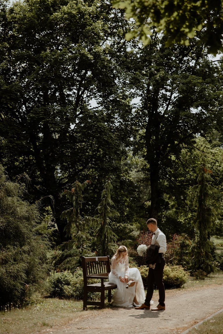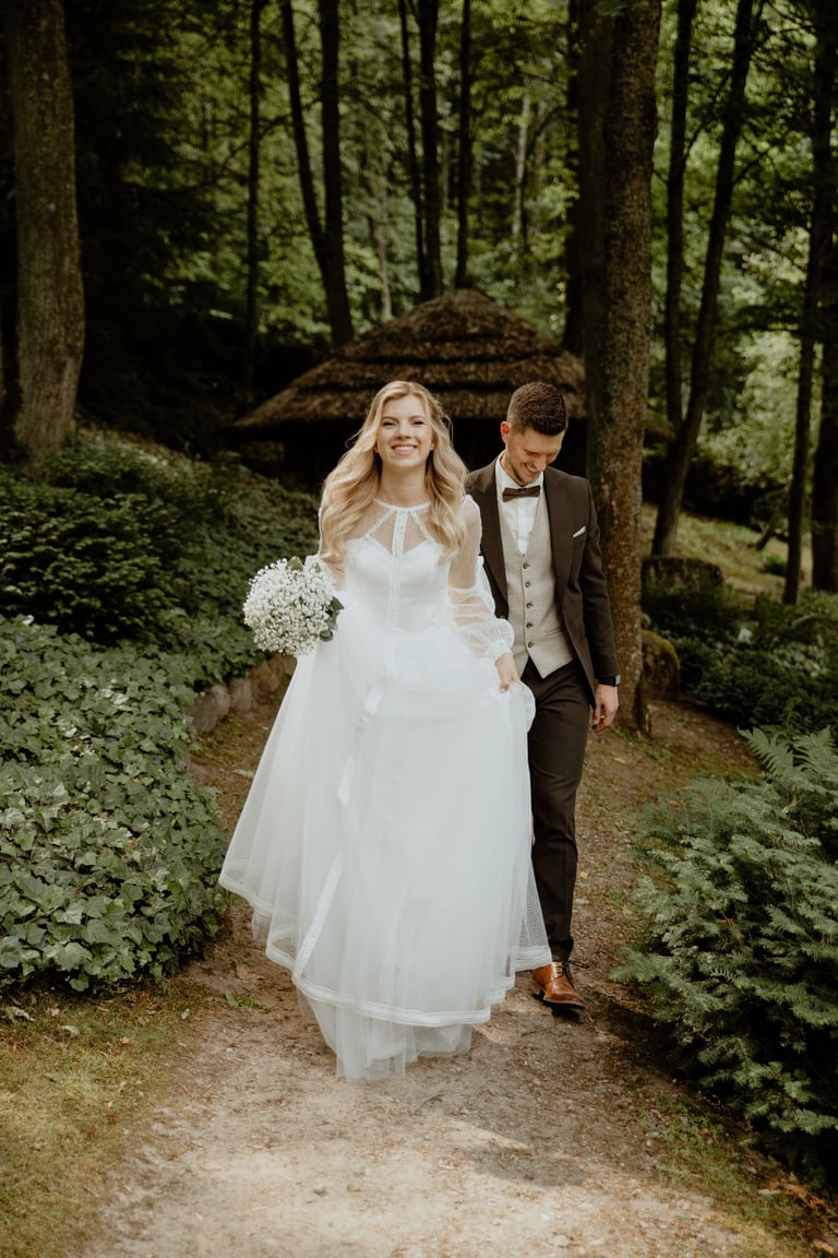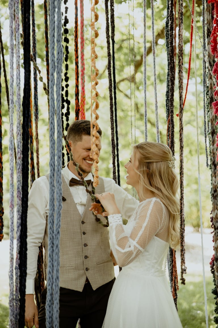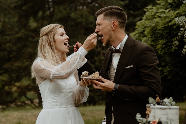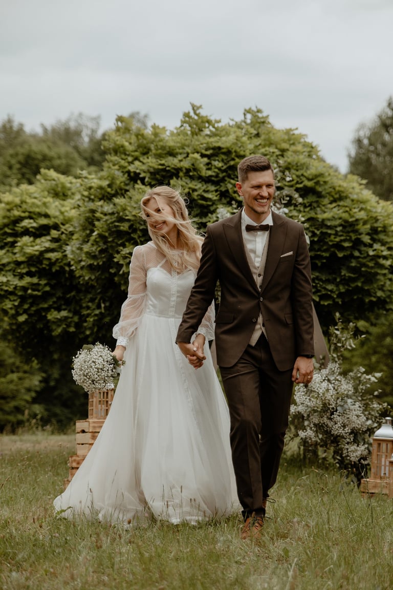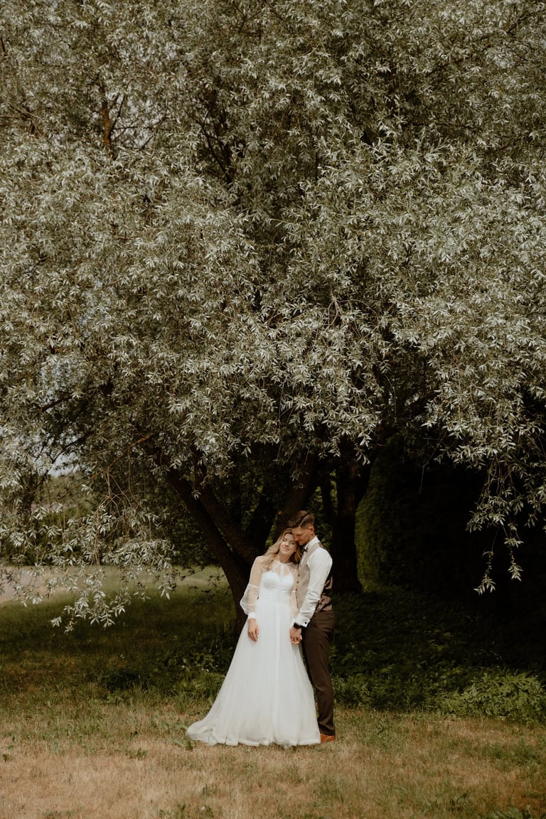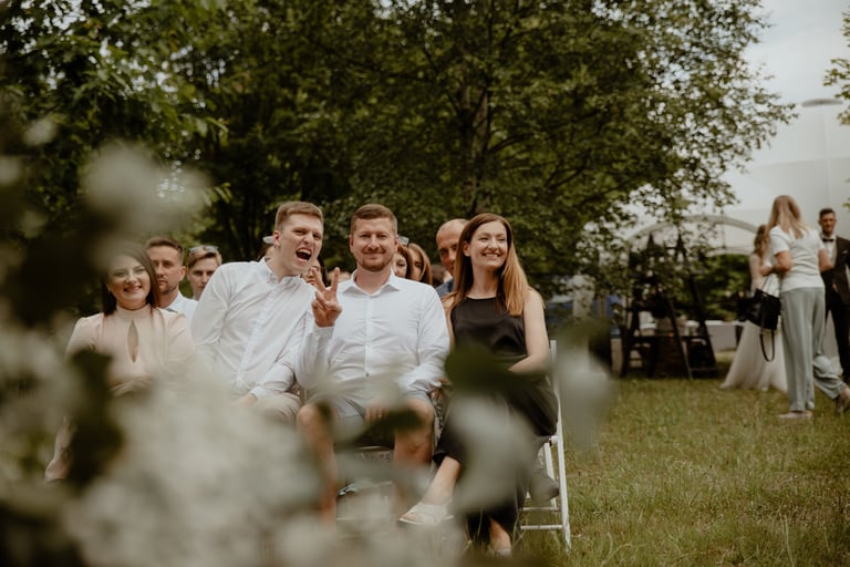 Vestuvių dieną susitikome parke, kuriame ir fotosesiją, ir ceremoniją, ir šventę turėjo. Buvo laabai karšta ir tuo pačiu trošku, stengėmės ieškoti paunksmės, gerti daug vandens ir per daug nesutepti suknelės, nes cermonija laukė po fotosesijos. Fotosesijai jau einant į pabaigą, vis labiau ir labiau kilo vėjas, plaukė tamsūs debesys. Laikėm kumščius, kad audra neužkluptų ceremonijos metu. Taigi, ceremonija praėjo be lietaus, o jau sveikinimų pabaigoje pradėjo po truputi krapnoti ir tada - liūtis. Visi sulindome į šventinę palapinę ir kuo puikiausiai tęsemė šventė. Kai tik koks protarpis be lietaus, grei svečiai pasifotografuoti lekia, dar vienas protarpis - nešame tortą į lauką pjaustyti. Lietus nuostabiai šventei nesutrukdė, o tik suteikė daugiau spalvų ir emocijų