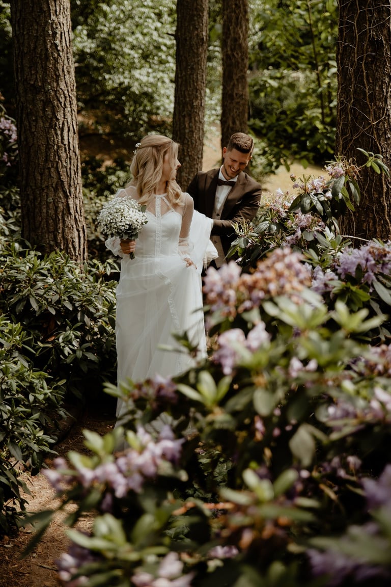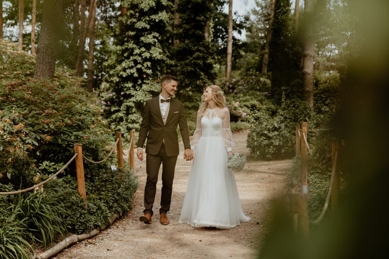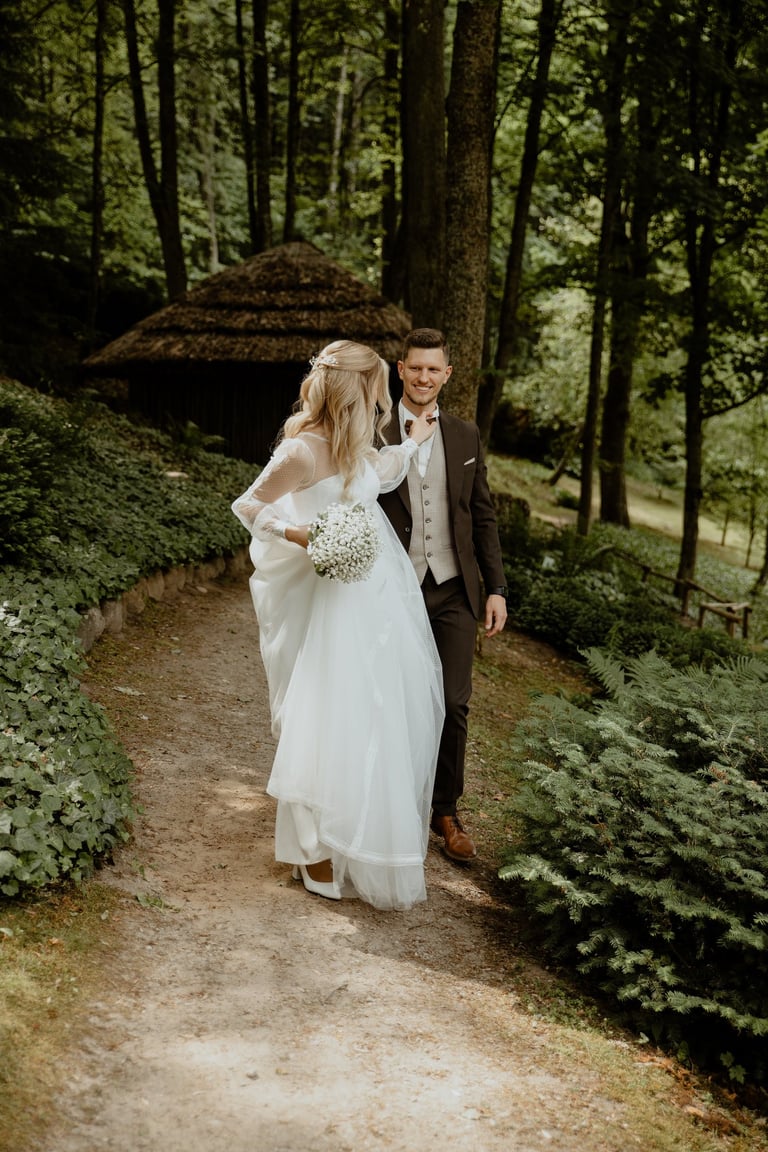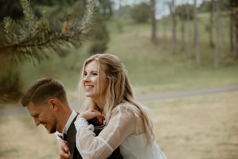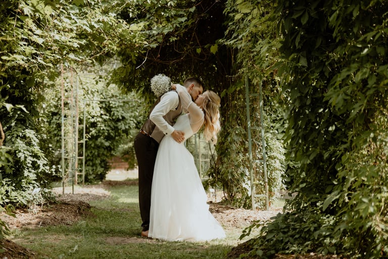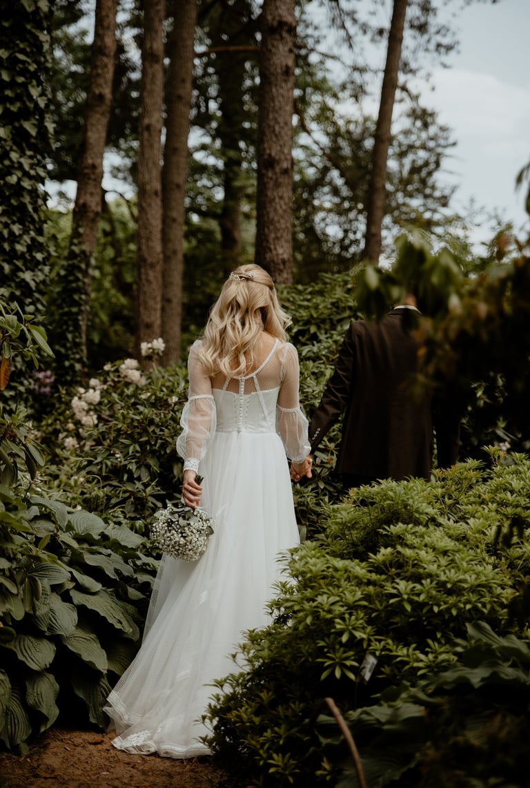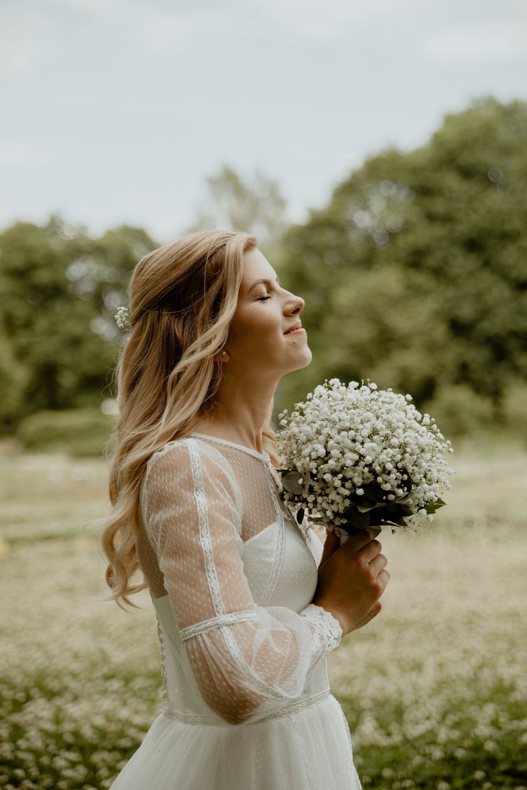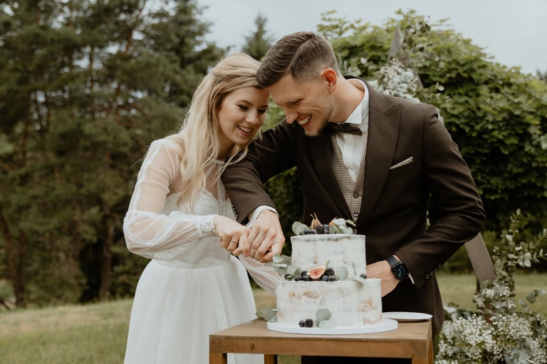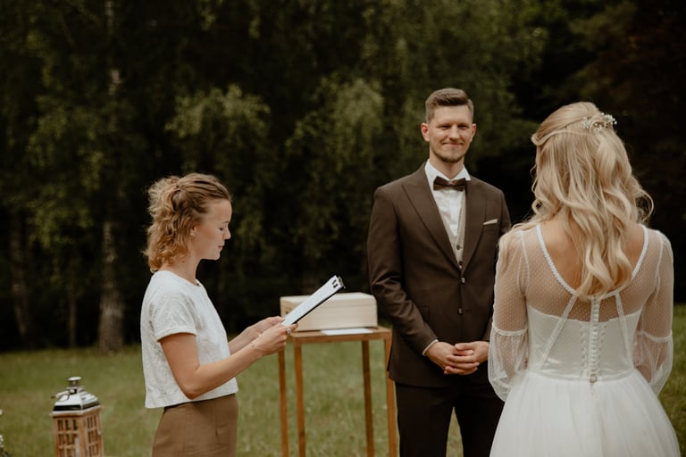 Vestuvių dieną susitikome parke, kuriame ir fotosesiją, ir ceremoniją, ir šventę turėjo. Buvo laabai karšta ir tuo pačiu trošku, stengėmės ieškoti paunksmės, gerti daug vandens ir per daug nesutepti suknelės, nes cermonija laukė po fotosesijos. Fotosesijai jau einant į pabaigą, vis labiau ir labiau kilo vėjas, plaukė tamsūs debesys. Laikėm kumščius, kad audra neužkluptų ceremonijos metu. Taigi, ceremonija praėjo be lietaus, o jau sveikinimų pabaigoje pradėjo po truputi krapnoti ir tada - liūtis. Visi sulindome į šventinę palapinę ir kuo puikiausiai tęsemė šventė. Kai tik koks protarpis be lietaus, grei svečiai pasifotografuoti lekia, dar vienas protarpis - nešame tortą į lauką pjaustyti. Lietus nuostabiai šventei nesutrukdė, o tik suteikė daugiau spalvų ir emocijų