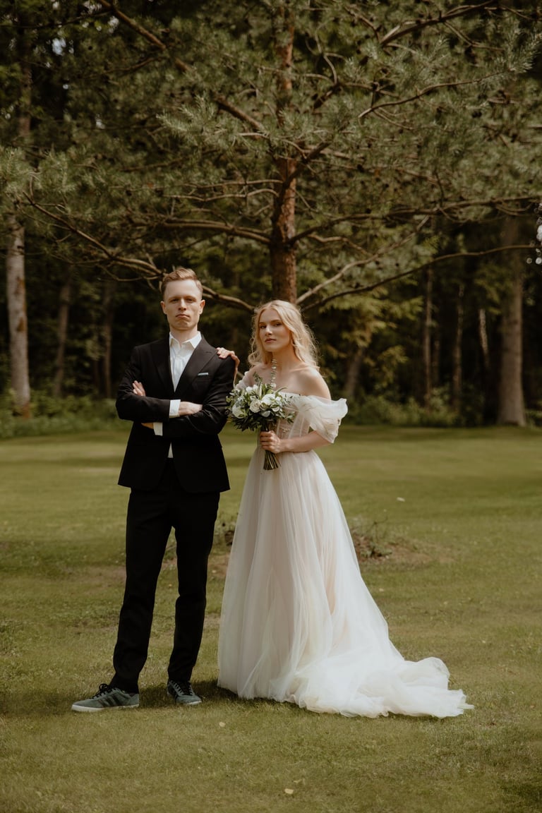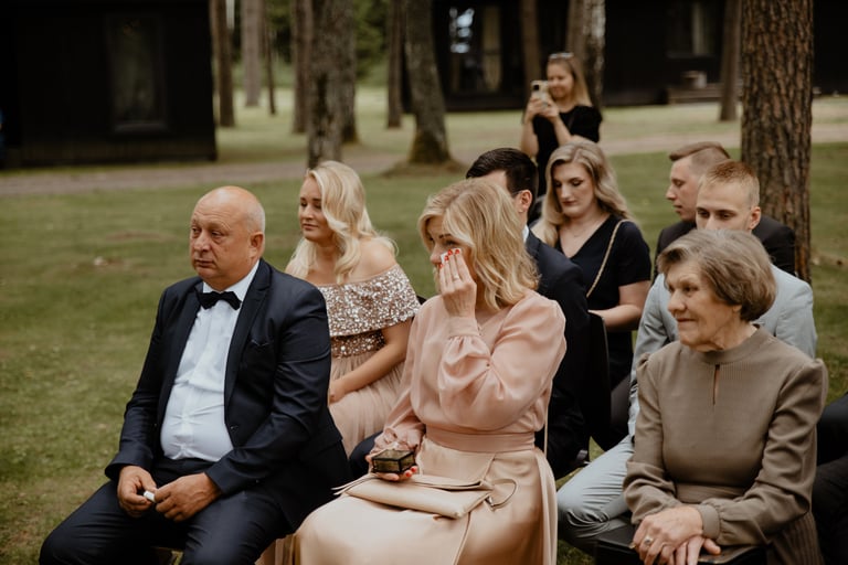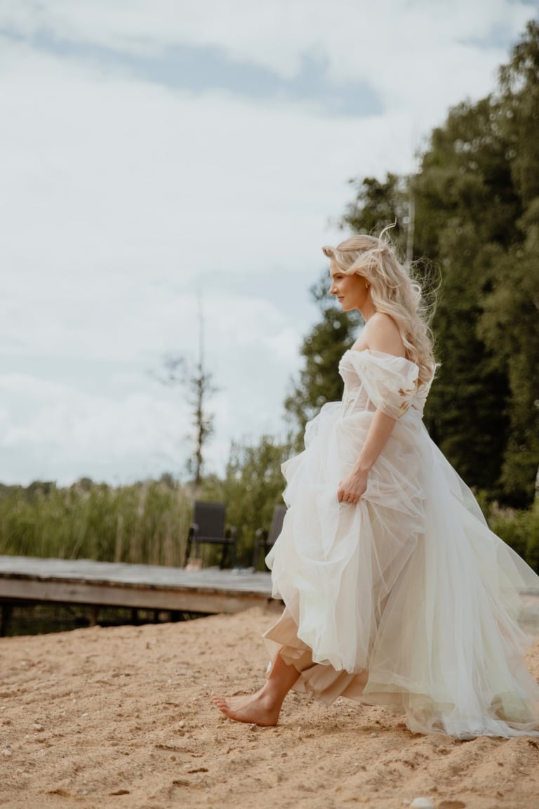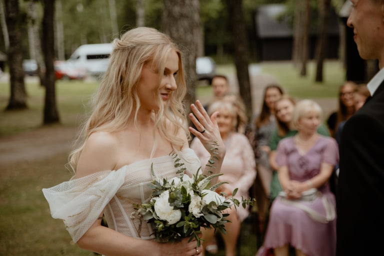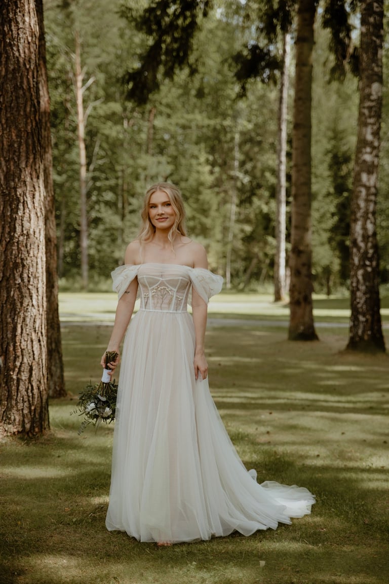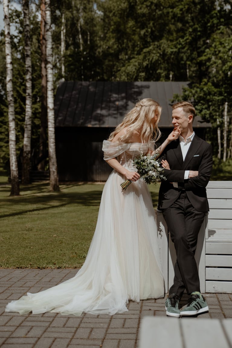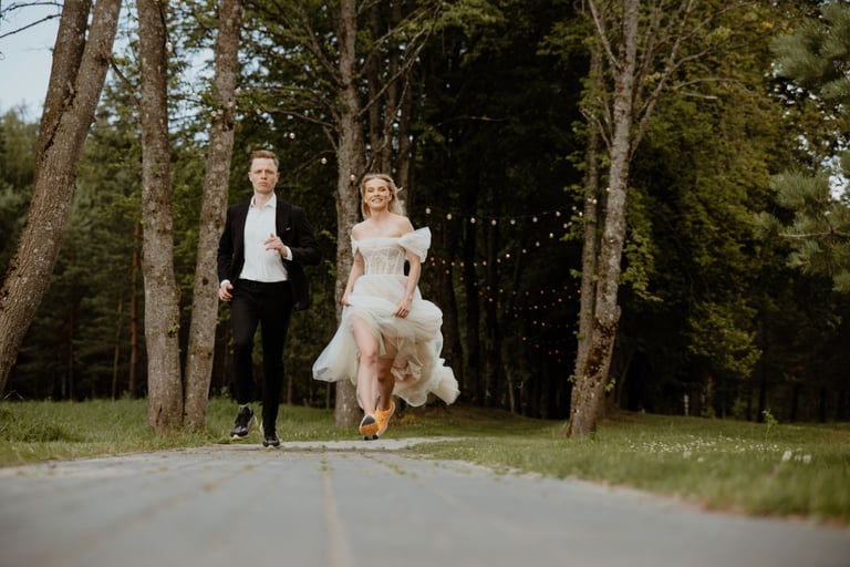 Liepos 8-oji. Anykščiai. Didžiulės pušys, itin didelė teritorija su tamsios medienos pagrindiniu pastatu ir namukais. Nuostabaus grožio ir subtilaus skonio vieta JUOSTA ANYKŠČIAI. Čia vyko visa vestuvių diena: pasiruošimas, fotosesija, ceremonija ir šventė. Kai nuėjau kartu su šauniosiomis planuotojomis pas Donatą į kambarį padėti užsidėti suknelę, negalėjau nepastebėti ore tvyrančio jautrumo ir nuoširdumo. Vos tik suknelė jau papuošė Donatą, nepameluosiu - netekau žado, atrodė stulbinančiai, kaip tikra gamtos fėja. Suknelės detalės su inkrustuotais augaliukais ir žalsvos bei rusvos spalvos tiuliu - išskirtinės