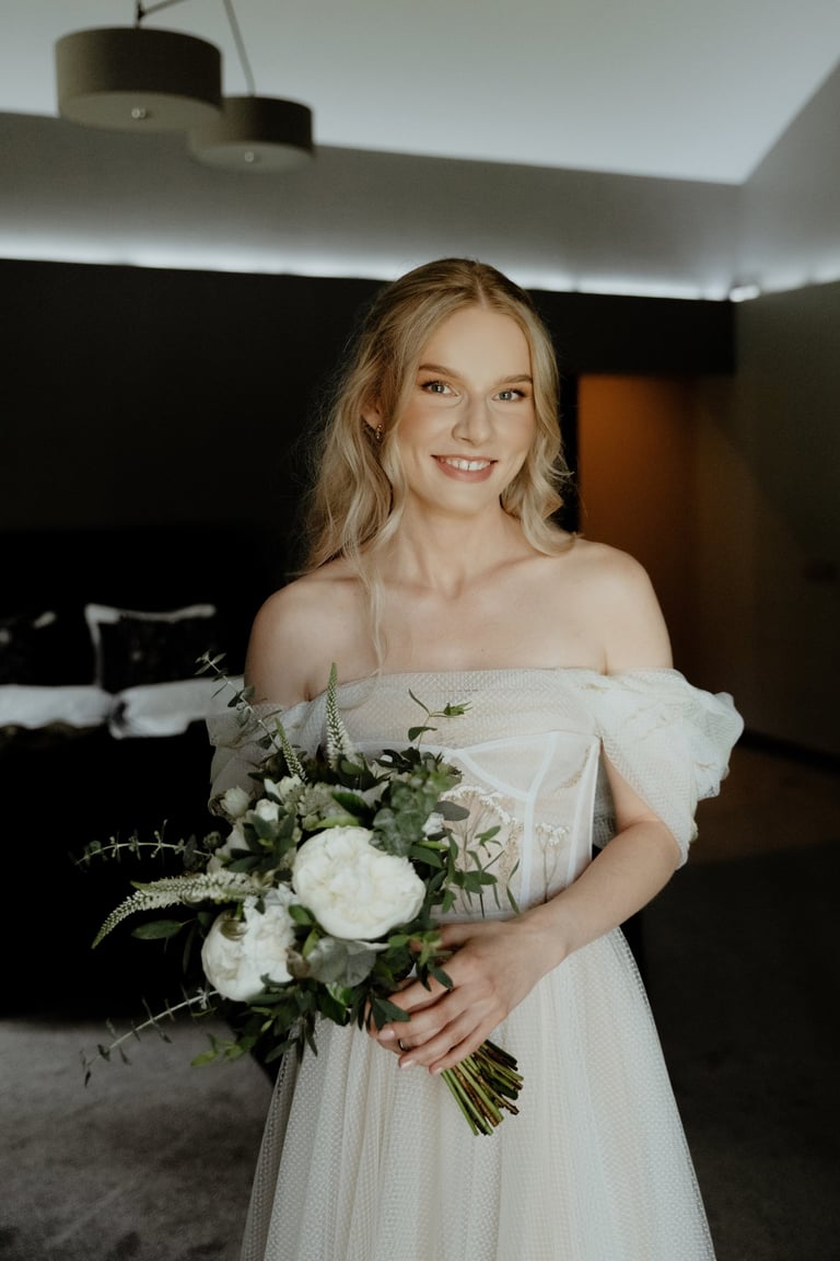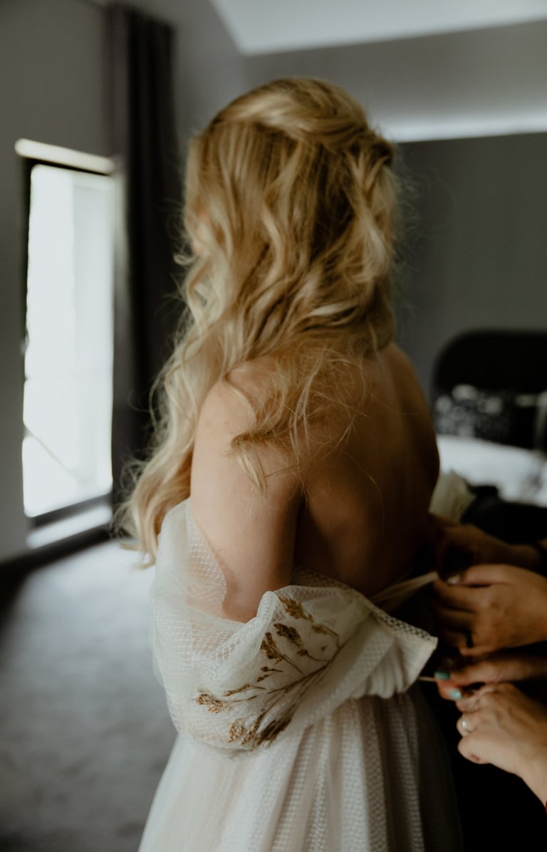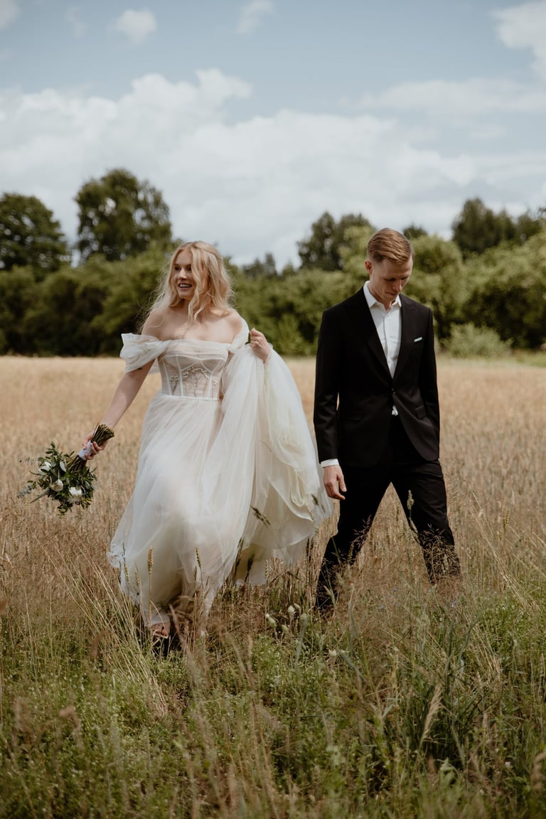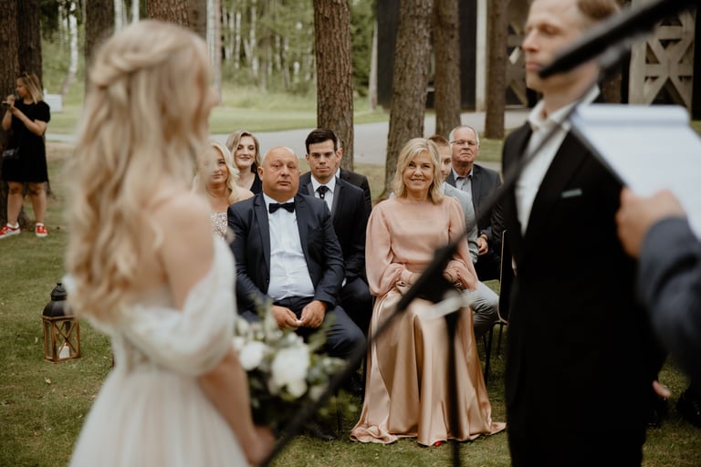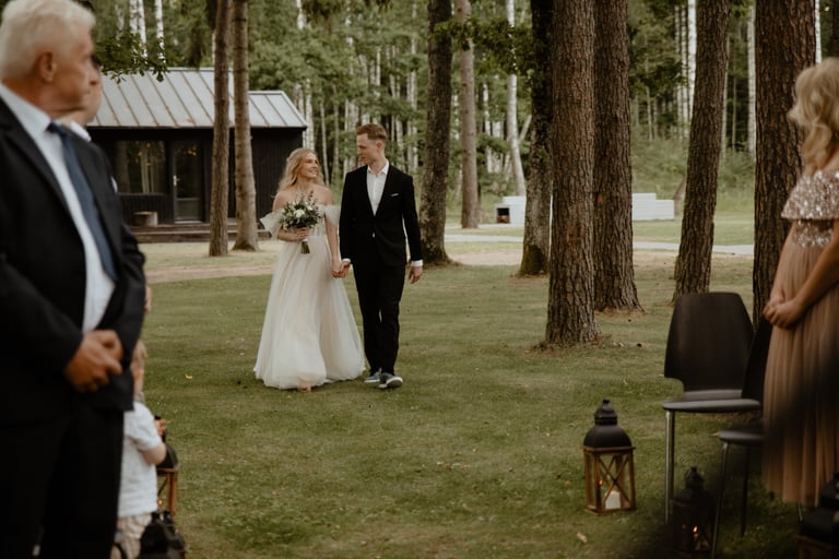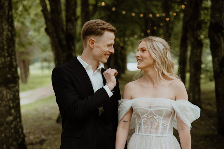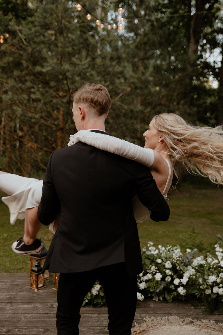 Liepos 8-oji. Anykščiai. Didžiulės pušys, itin didelė teritorija su tamsios medienos pagrindiniu pastatu ir namukais. Nuostabaus grožio ir subtilaus skonio vieta JUOSTA ANYKŠČIAI. Čia vyko visa vestuvių diena: pasiruošimas, fotosesija, ceremonija ir šventė. Kai nuėjau kartu su šauniosiomis planuotojomis pas Donatą į kambarį padėti užsidėti suknelę, negalėjau nepastebėti ore tvyrančio jautrumo ir nuoširdumo. Vos tik suknelė jau papuošė Donatą, nepameluosiu - netekau žado, atrodė stulbinančiai, kaip tikra gamtos fėja. Suknelės detalės su inkrustuotais augaliukais ir žalsvos bei rusvos spalvos tiuliu - išskirtinės