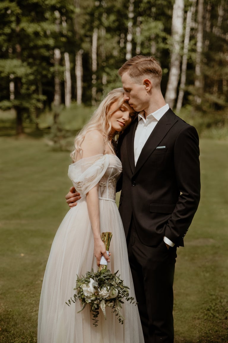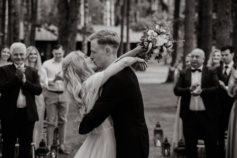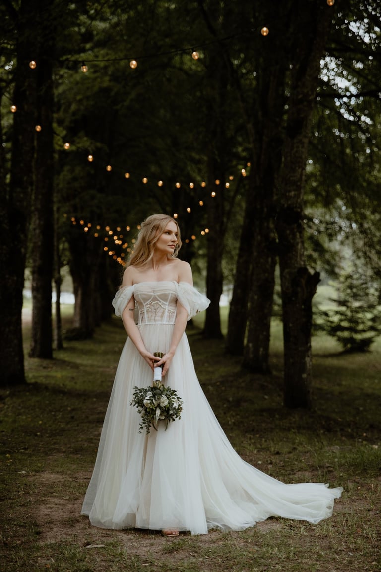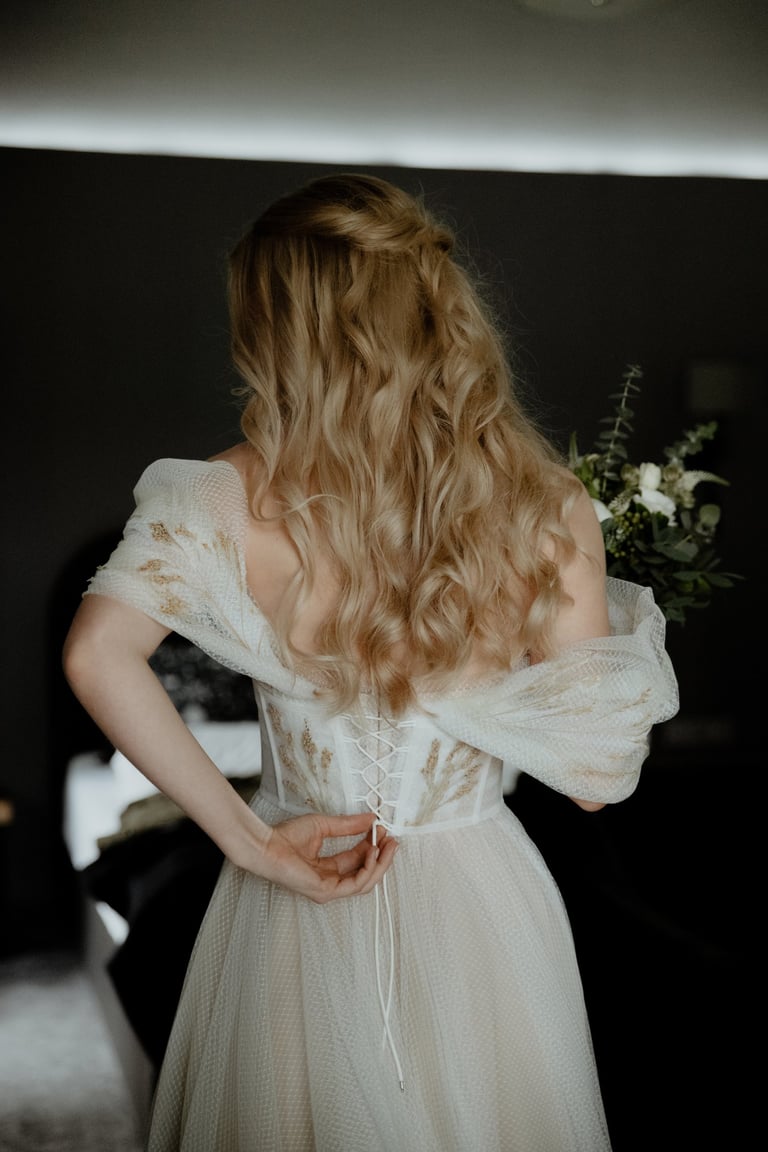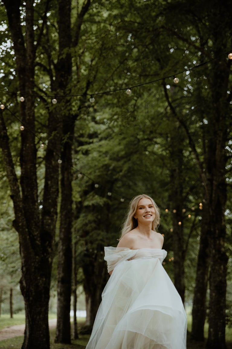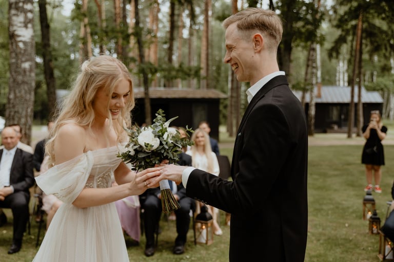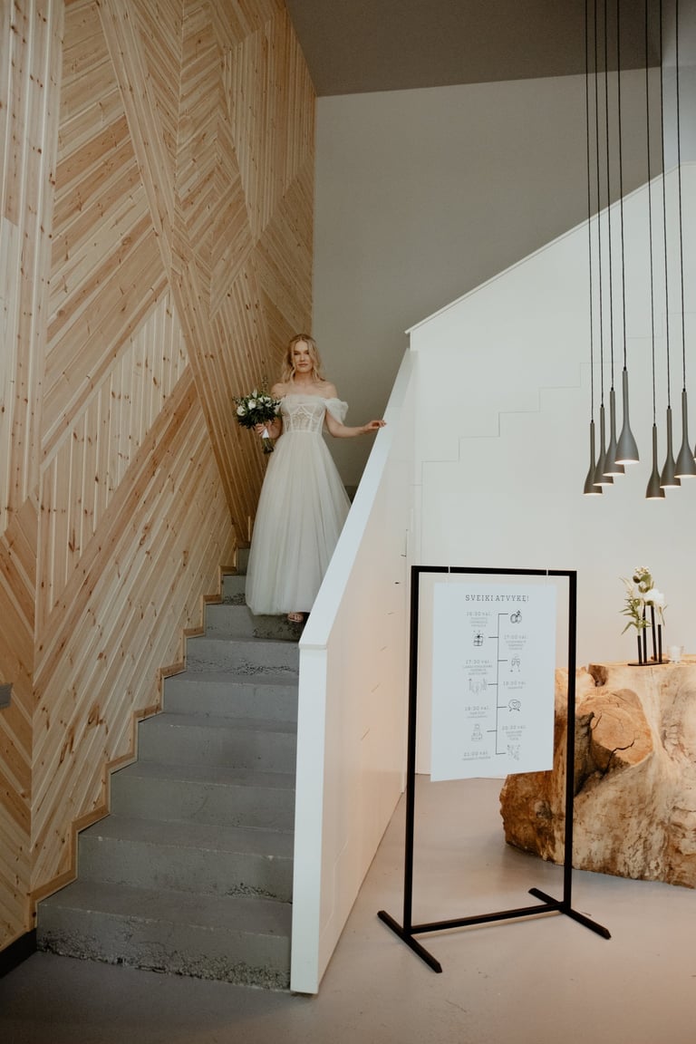 Liepos 8-oji. Anykščiai. Didžiulės pušys, itin didelė teritorija su tamsios medienos pagrindiniu pastatu ir namukais. Nuostabaus grožio ir subtilaus skonio vieta JUOSTA ANYKŠČIAI. Čia vyko visa vestuvių diena: pasiruošimas, fotosesija, ceremonija ir šventė. Kai nuėjau kartu su šauniosiomis planuotojomis pas Donatą į kambarį padėti užsidėti suknelę, negalėjau nepastebėti ore tvyrančio jautrumo ir nuoširdumo. Vos tik suknelė jau papuošė Donatą, nepameluosiu - netekau žado, atrodė stulbinančiai, kaip tikra gamtos fėja. Suknelės detalės su inkrustuotais augaliukais ir žalsvos bei rusvos spalvos tiuliu - išskirtinės