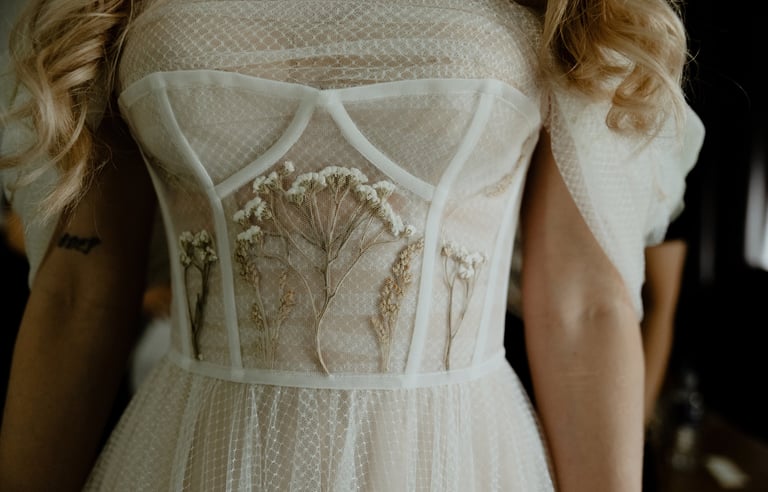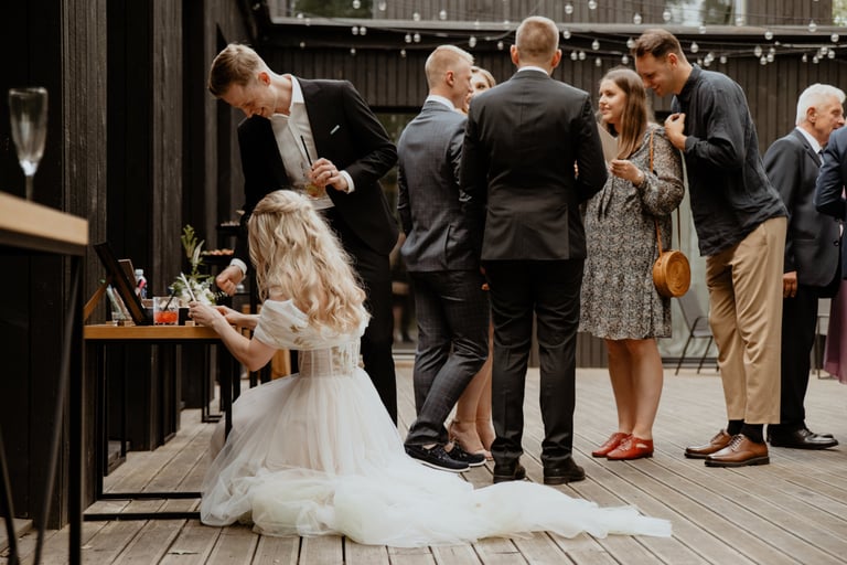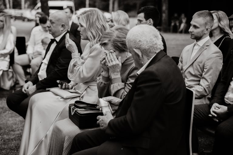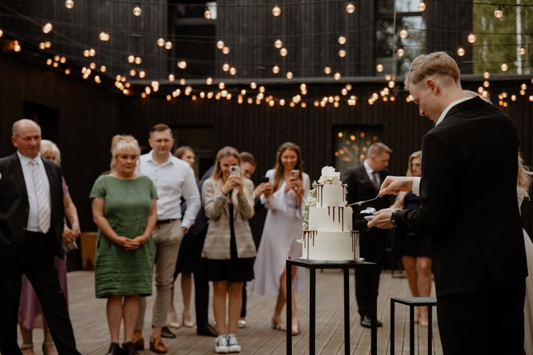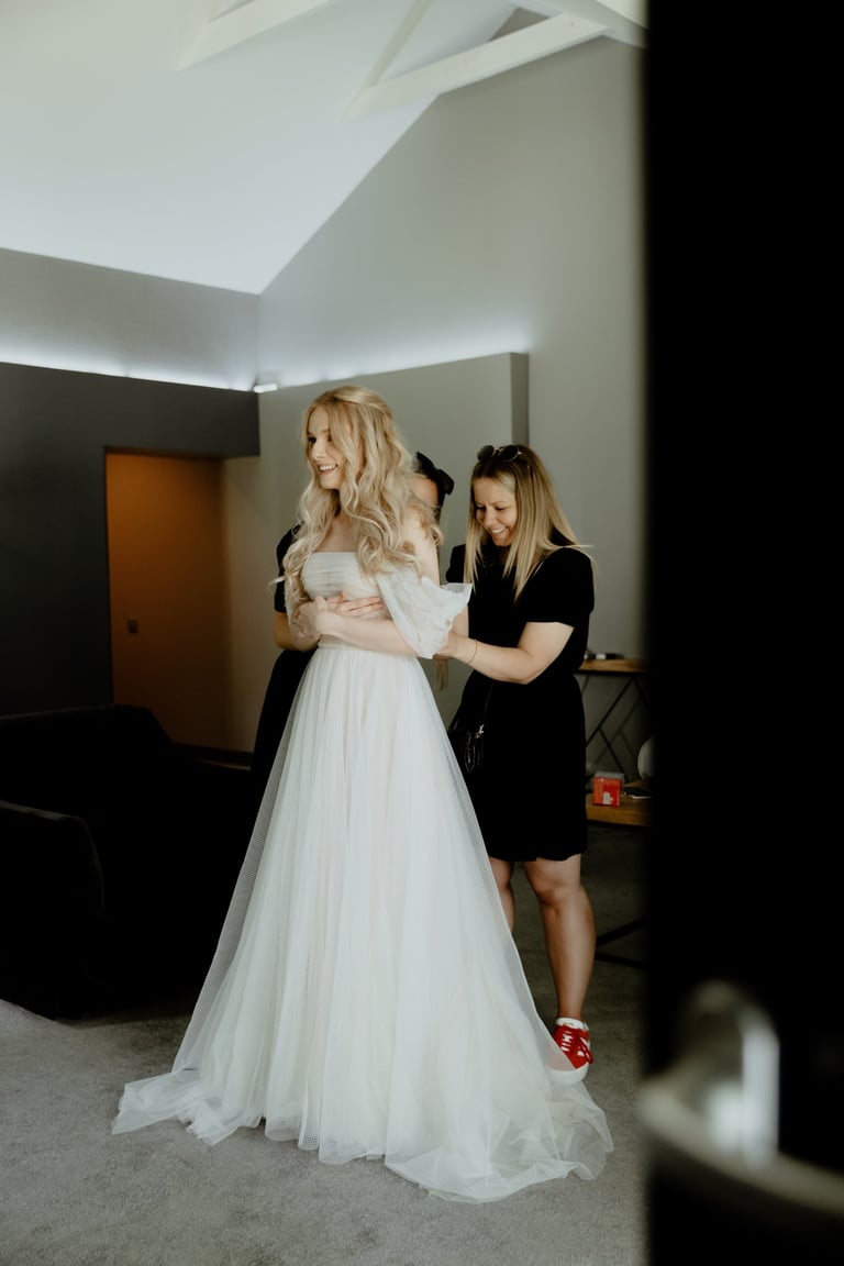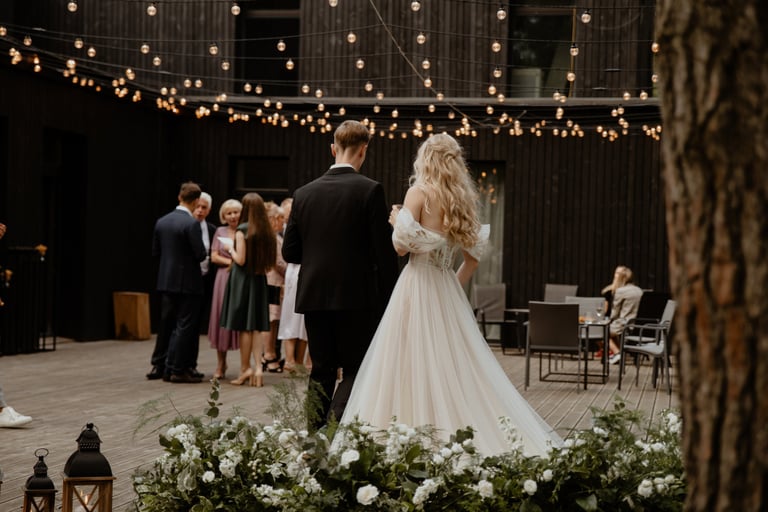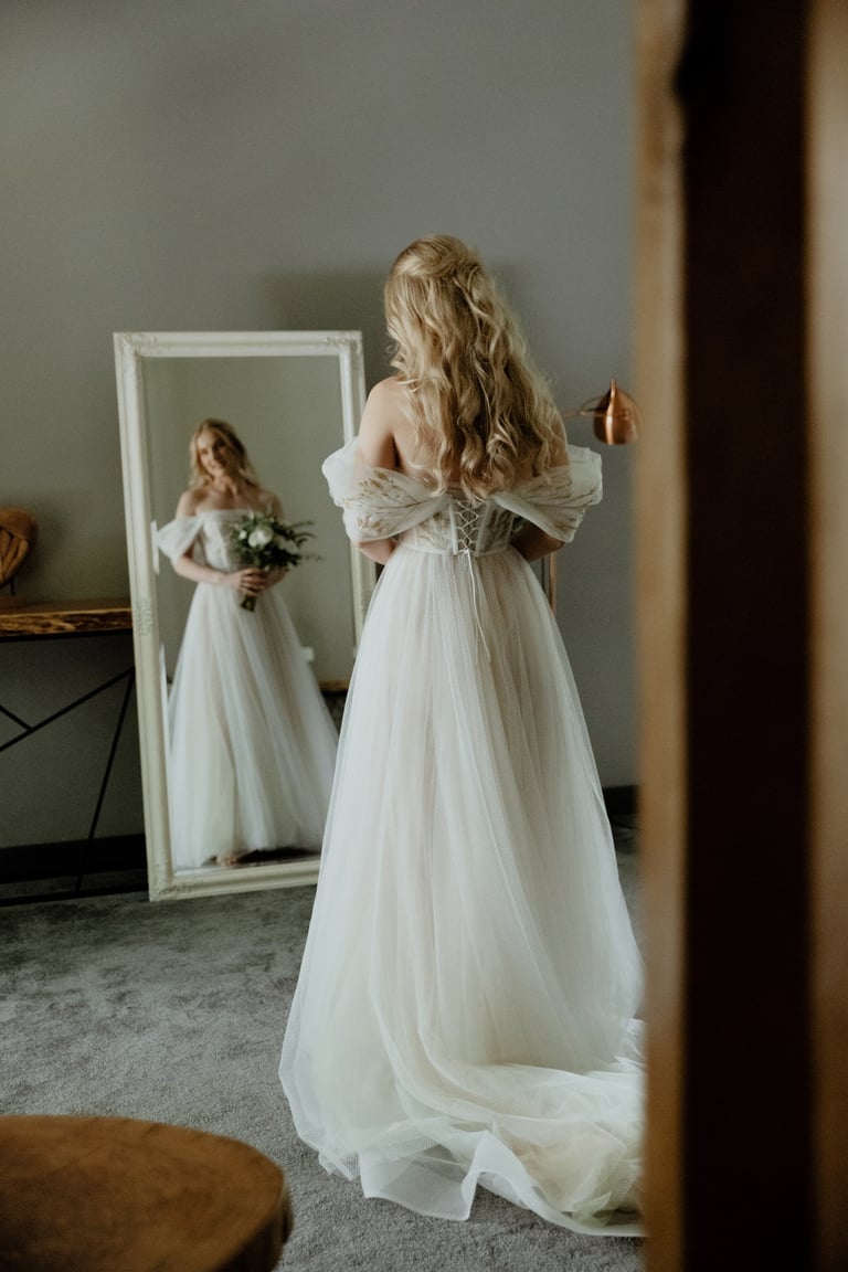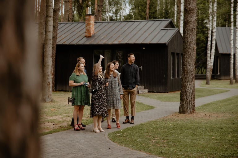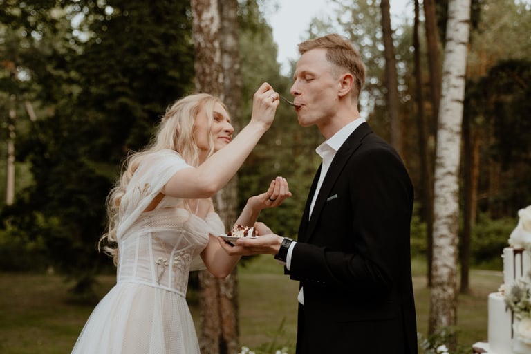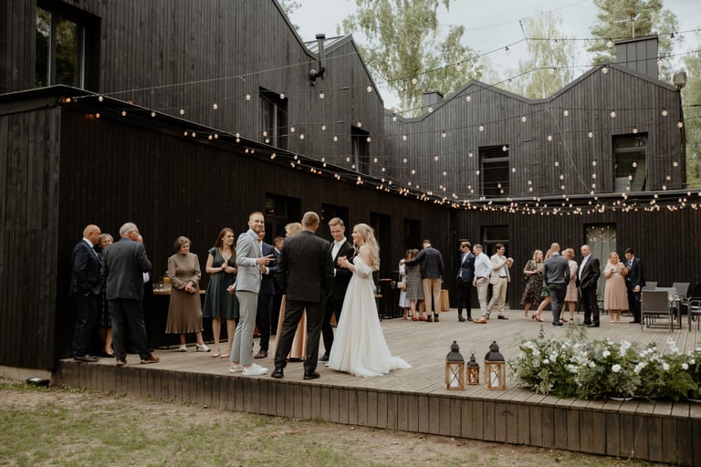 Liepos 8-oji. Anykščiai. Didžiulės pušys, itin didelė teritorija su tamsios medienos pagrindiniu pastatu ir namukais. Nuostabaus grožio ir subtilaus skonio vieta JUOSTA ANYKŠČIAI. Čia vyko visa vestuvių diena: pasiruošimas, fotosesija, ceremonija ir šventė. Kai nuėjau kartu su šauniosiomis planuotojomis pas Donatą į kambarį padėti užsidėti suknelę, negalėjau nepastebėti ore tvyrančio jautrumo ir nuoširdumo. Vos tik suknelė jau papuošė Donatą, nepameluosiu - netekau žado, atrodė stulbinančiai, kaip tikra gamtos fėja. Suknelės detalės su inkrustuotais augaliukais ir žalsvos bei rusvos spalvos tiuliu - išskirtinės