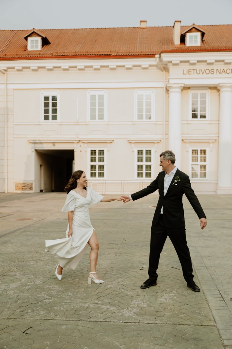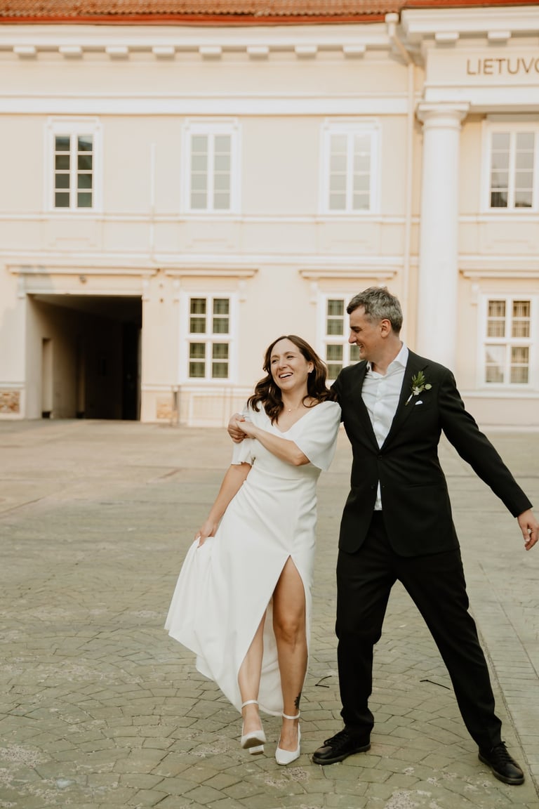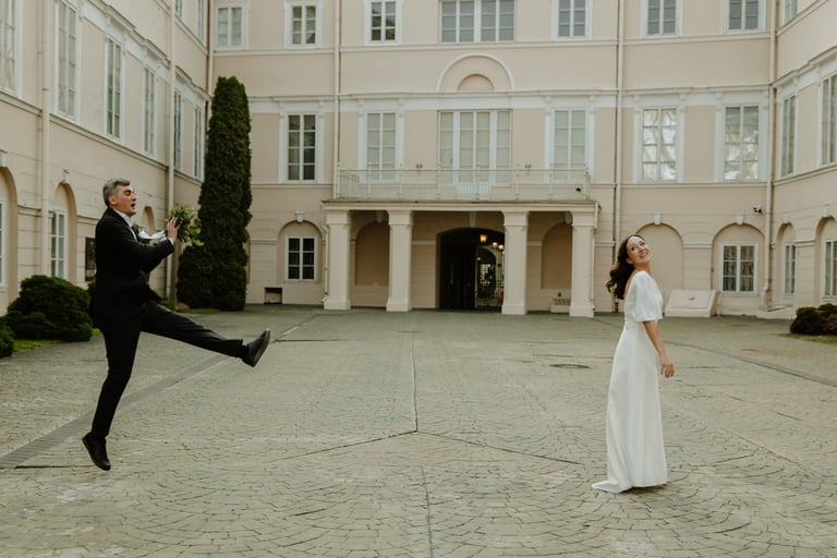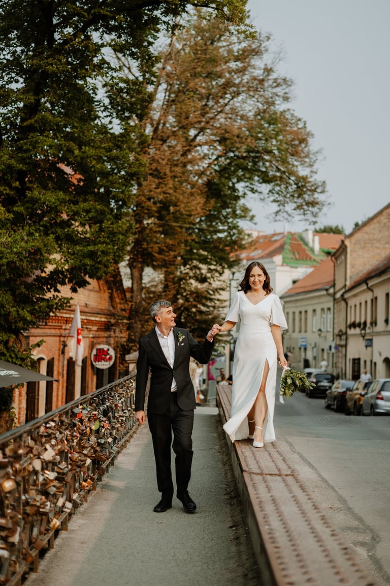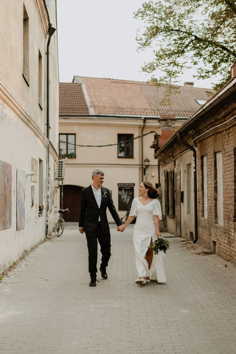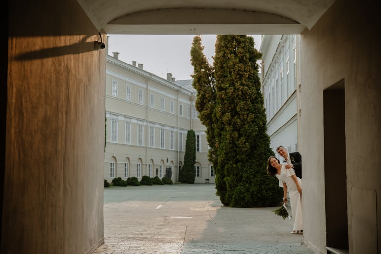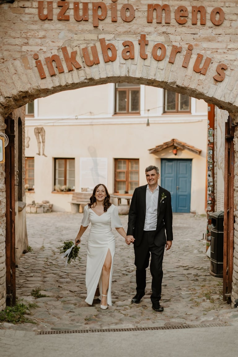 Vos tik išėjom į miestą, prasidėjo jų fotokelionė. Vaikščiojom ir bėgiojom per gatves, užklydom į veidrodinį kiemelį, kvailiojom ir daug juokėmės. Laikas praskrido taip greit, kad Indrė su Vytautu nenorėjo baigti fotosesijos, bet jau turėjom keliauti į restorano kiemelį, kuriame svečiai laukė ceremonijos. Be žaismo neapsieita ir joje. Dar tokios mėgstančios animacinius filmus, žaidimus ir keliones poros nebuvau sutikusi. JŪS NEREALŪS!