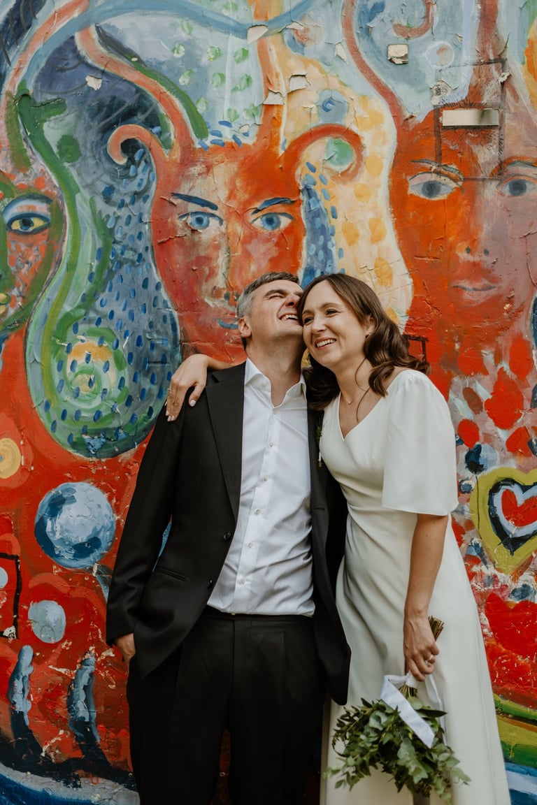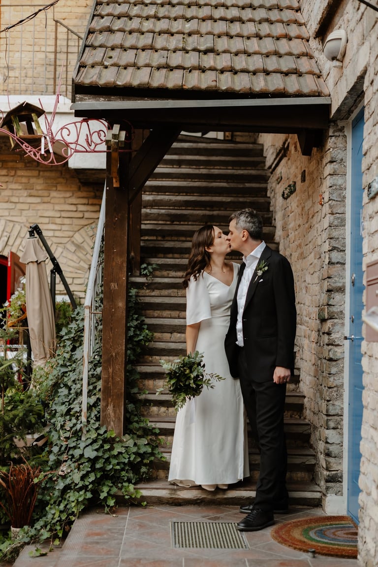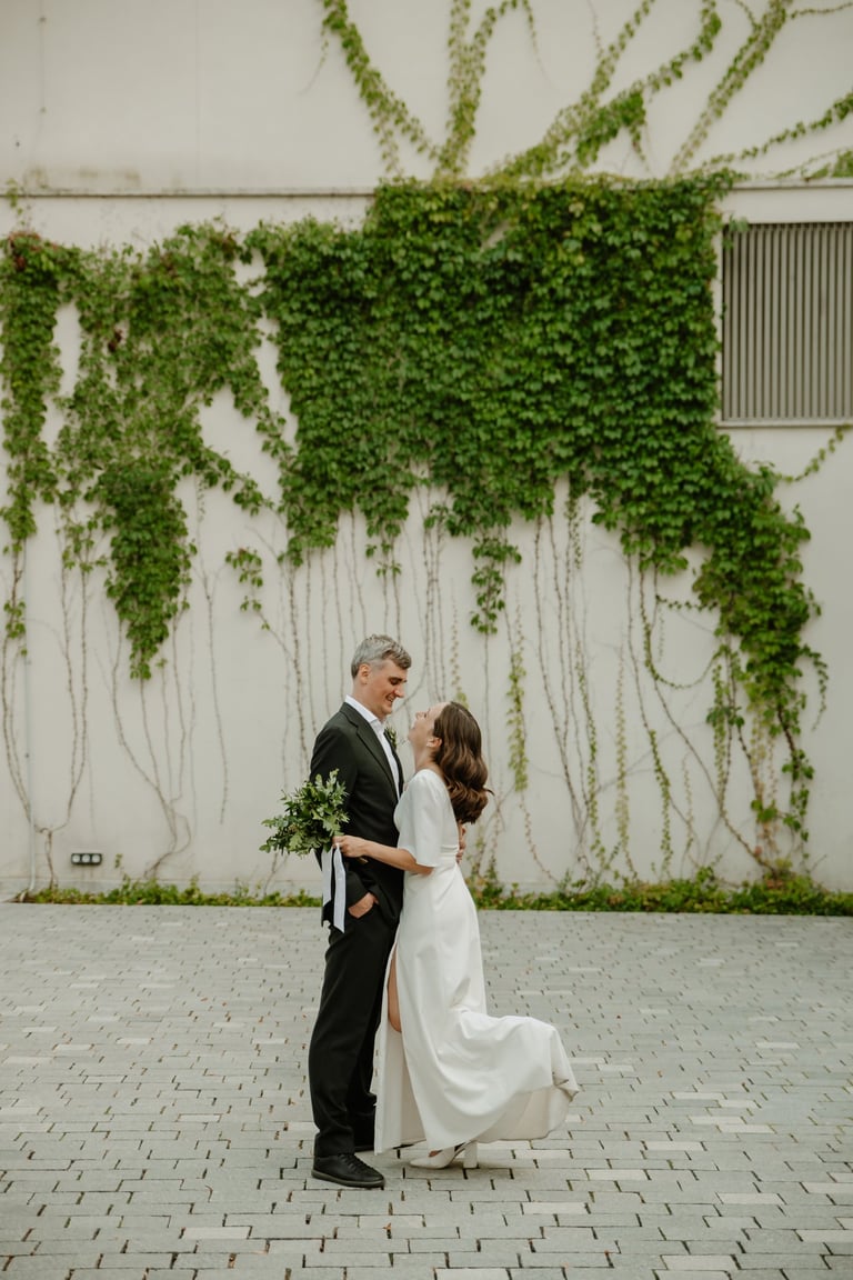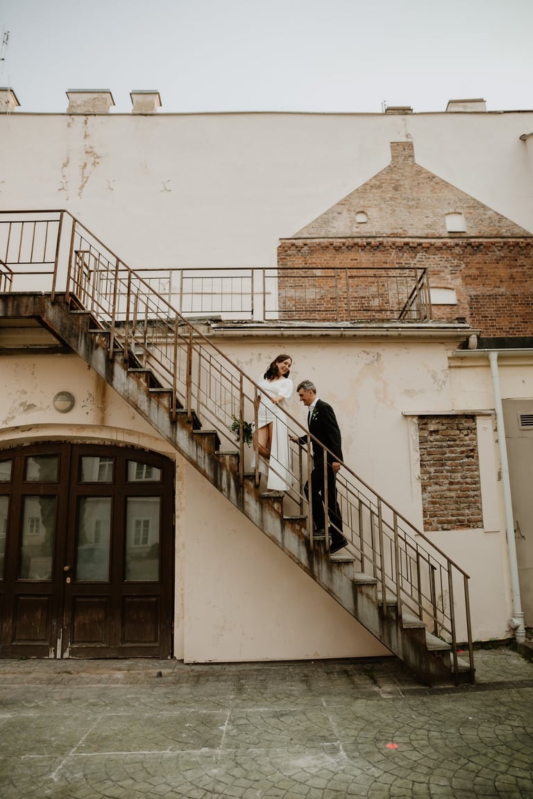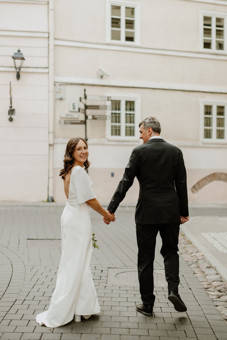 Vos tik išėjom į miestą, prasidėjo jų fotokelionė. Vaikščiojom ir bėgiojom per gatves, užklydom į veidrodinį kiemelį, kvailiojom ir daug juokėmės. Laikas praskrido taip greit, kad Indrė su Vytautu nenorėjo baigti fotosesijos, bet jau turėjom keliauti į restorano kiemelį, kuriame svečiai laukė ceremonijos. Be žaismo neapsieita ir joje. Dar tokios mėgstančios animacinius filmus, žaidimus ir keliones poros nebuvau sutikusi. JŪS NEREALŪS!